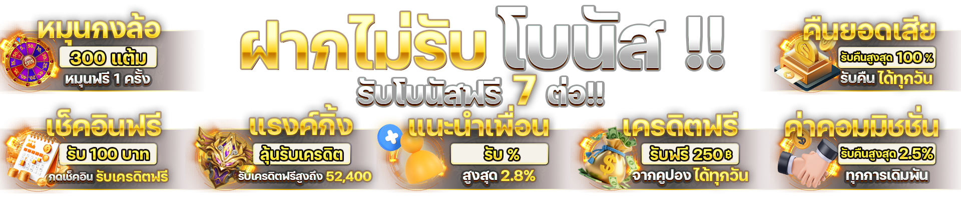 ตอบ : - โบนัสต้อนรับสมาชิกใหม่ 100% - คืนยอดเสีย 10% ทุกสัปดาห์ - แนะนำเพื่อนรับค่าคอมมิชชั่น 0.5% - กิจกรรมแจกเครดิตฟรีประจำเดือน - โปรสะสมแต้มแลกรางวัล